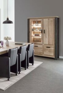 Vitrine 3 portes et 1 porte vitrée. Décor vieux chêne, chant ABS 2mm ( Polymère thermoplastique). Clic-Charnières métal avec freins. Tablette, fond et cotés en 38mm creux ( type alvéolaire). Portes en 28 mm creux. Etagères en 16mm et 28/38mm creux. Porte en verre en MDF avec verre 4mm durçi sécurit. Pieds décor effet acier en MDF 80x80mm creux.